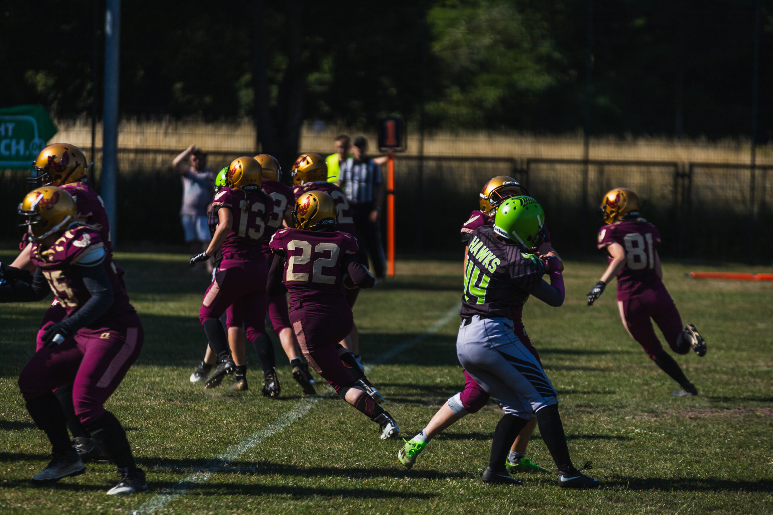 Gleich zu Beginn konnten die Leipzig Hawks recht schnell die ersten 7 Punkte erzielen. Die Regensburger konnten durch einen schönen Lauf von #81 Julia Bauer mit 6 Punkten nachziehen. Doch dann folgte ein Kickoff Return Touchdown der Gastgeber und danach gleich ein Weiterer auf Seiten der Hawks. Somit stand es ziemlich schnell 21:06 für Leipzig. Doch davon ließen sich die Phoenix nicht beeindrucken. Die Defense konnte immer besser ins Spiel finden und verhinderten weitere Punkte der Gastgeber. Durch einen weiteren Lauf von #81 Julia Bauer und einem schönen Catch von #84 Verena Bosser konnten die nächsten 12 Punkte eingefahren werden. Zur Halbzeit stand es daher 21:18 für Leipzig.
